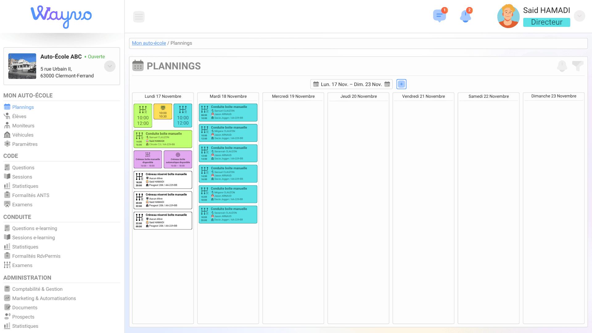 Wayvo intègre une solution complète de code en ligne : base de 2000 questions mises à jour, examens blancs, statistiques détaillées, algorithme d’entraînement intelligent, et contenus multimédias. Suivez la progression de vos élèves en temps réel et offrez-leur une expérience d’apprentissage fluide, moderne et ultra motivante, sans outil externe.