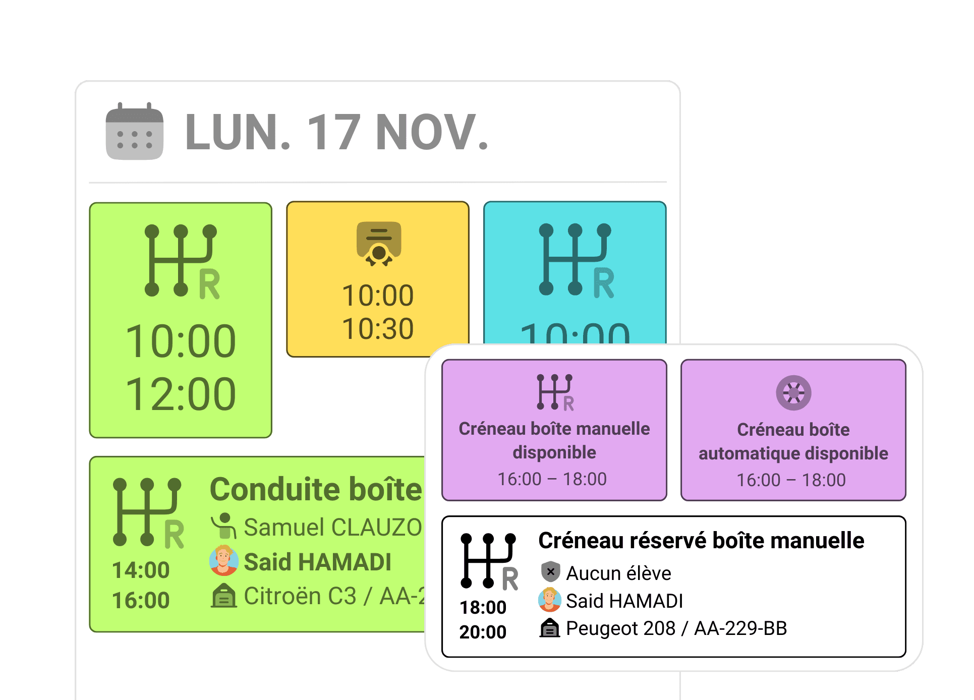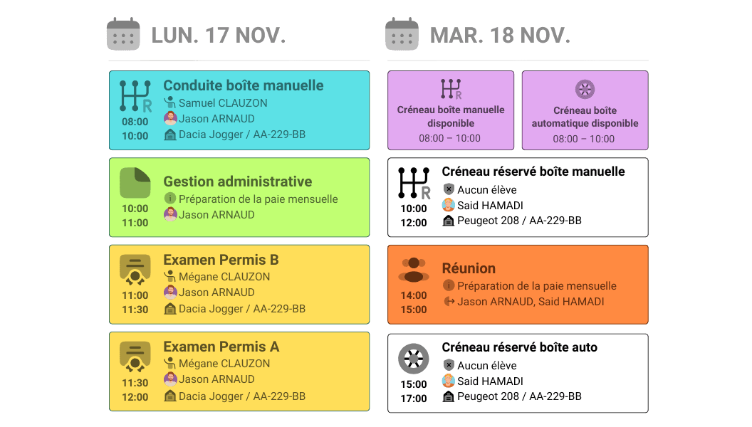 Utilisez votre planning en cascade pour gérer aussi bien les heures de conduite de vos moniteurs et de vos élèves que vos tâches personnelles !